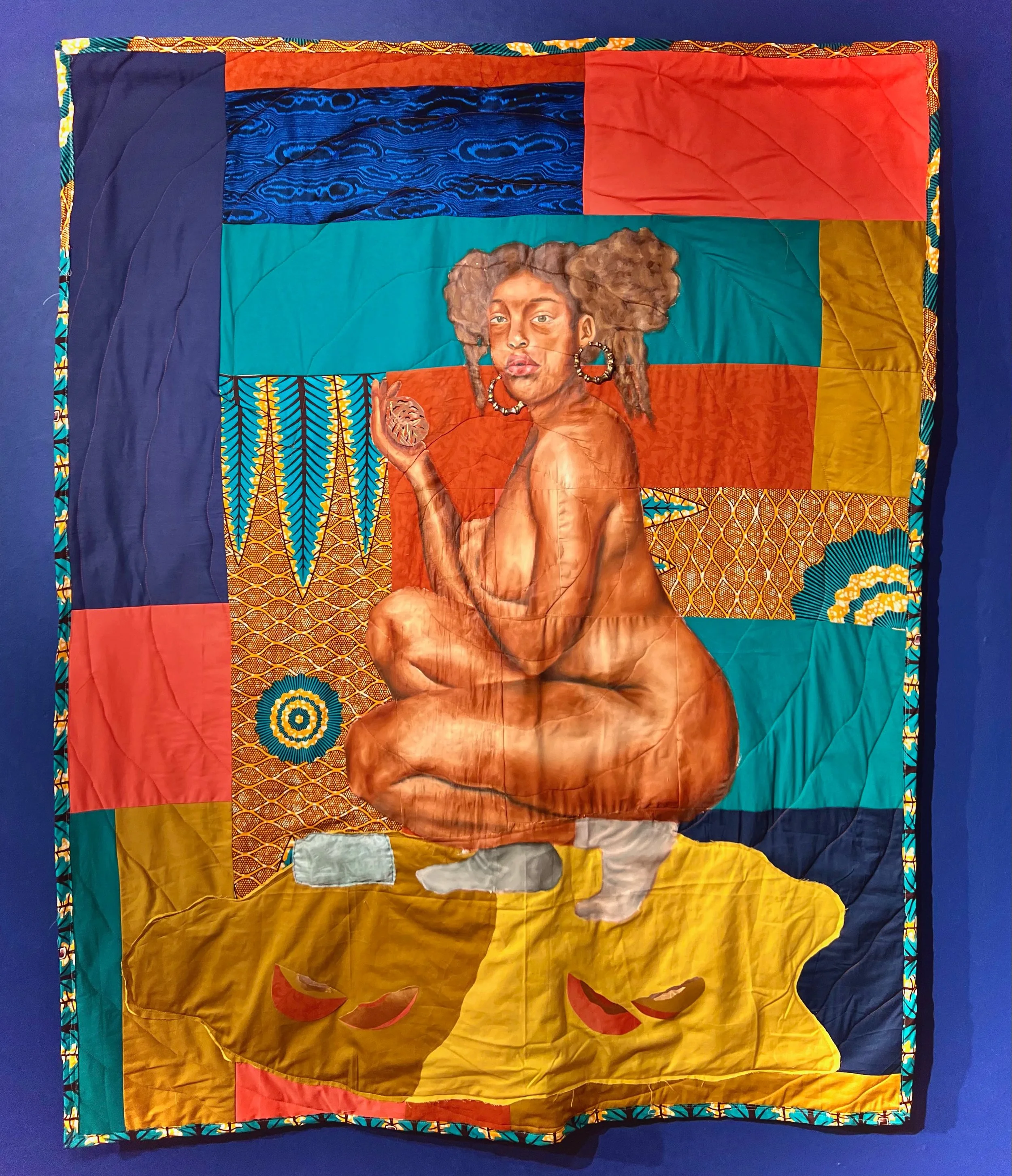 My work is heavily influenced by my relationships with my late grandmothers, my ancestors, or my ‘Kindred’ as I call them. I discovered quilting three years ago at age twenty after learning that quilting may have been used in the underground railroad in an African American Studies class. When I first told my grandfather about my sewing, I learned he had kept quilts and fabric from my late grandmother after she passed away. She was a quilter in the 1970s while living in Georgia and had learned to sew by watching her own mother. A few days later, my mother and I pulled up in her car and were surprised to find barrels full of my grandmother’s unfinished quilts and both used and unused fabrics. I was stunned. It was a sign that my grandmothers were alive within me, guiding me all along. And my grandfather was the messenger that would lead me to the purpose of my current body of work. Over time, I have taught myself a process of improvisational quilting to physically connect to my grandmother and the practices of my women ancestors. By incorporating the very fabrics and unfinished quilts she touched and sewed herself, my practice becomes a space to stitch together the stories and memories of black women across generations. My work tells the story of a black woman’s journey to find herself. My figures are representations of me and the women around me. Through them, I construct stories of our own blackness, femininity and sexuality beyond the violence and hypersexualization that we face as Black women in a colonized world. My Kindred who have lived through slavery and Jim Crow directly aid me in the process of art-making while simultaneously guiding me on my own path of womanhood. The figures within my work are women living in comfortable environments where they may reveal their authentic self. They are Black women, often partially or fully nude. We take ownership of our bodies and refuse to be controlled by imposed standards of race, gender or sexuality. Guided by the Kindred, both myself and my figures may find our paths to our true selves, imagining who we may have been without the interference of colonization.